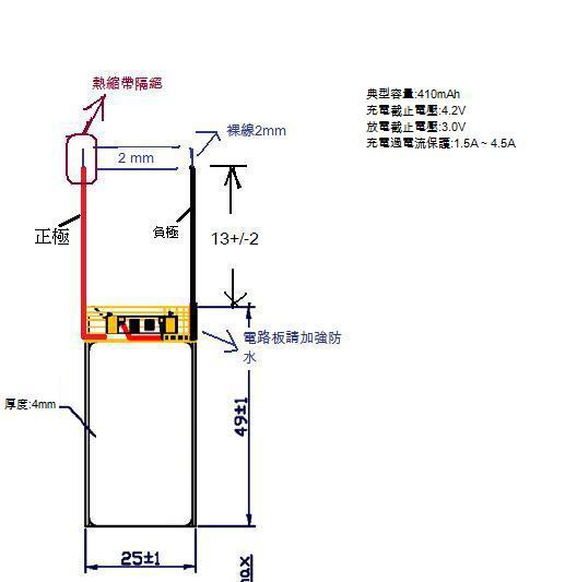 需求:含保護線路之鋰聚合物電池.需要容量410mAh 及 300mAh(左右) 兩種 尺寸及保護電路規格如圖示, 請先提供規格書及報價. 確認適用后再提供樣品 初期需求量約500顆;量產約3000顆
