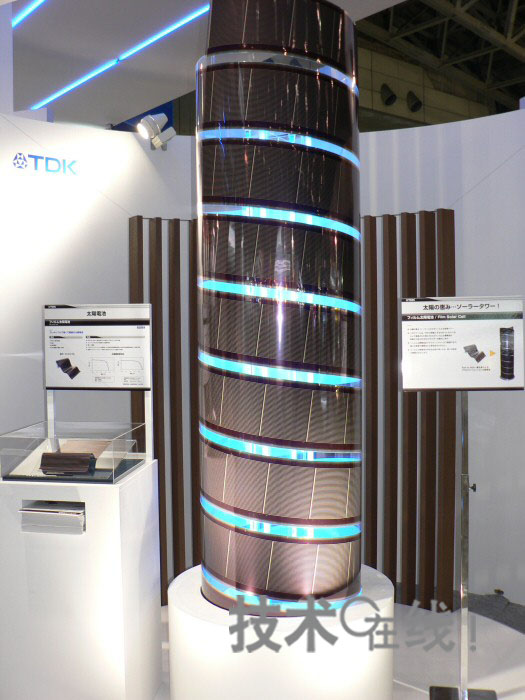 TDK在“CEATEC JAPAN 2009”上参考展出了可采用卷对卷技术一条龙生产的薄膜型非晶硅太阳能电池。该电池为柔性产品,除了可设置在曲面上使用之外,其薄型、轻量的特点使得耐冲击性也比较高。设想用于手机等各种电子产品及住宅/户外发电等用途。