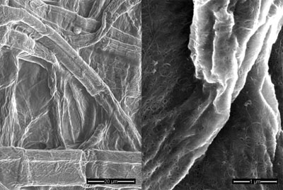 左:电子显微镜扫描下的普通纸张;右:涂上碳纳米管墨水的纸张。