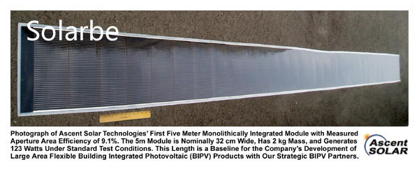 Ascent Technologies于09年6月公开的5m长32cm宽的CIGS型模块。开口部的转换效率为9.1%。