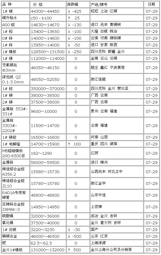 7月20日广东有色金属市场行情(铜镍锌锡铝钴)