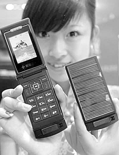 题图:2007年5月,全球首部光能手机在中国问世。手机机身表面被太阳能电池板覆盖,在阳光、阴天、灯光、烛光下可随时为手机锂电池充电,从而有效地节省能源。