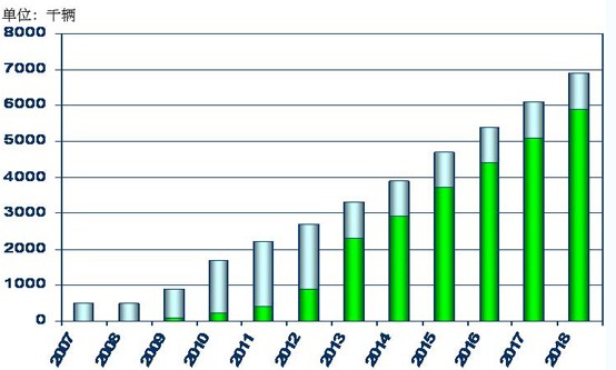 图1:全球混合动力汽车(HEV)、充电式混合动力电动汽车(PHEV)、纯电动汽车(EV)市场规模