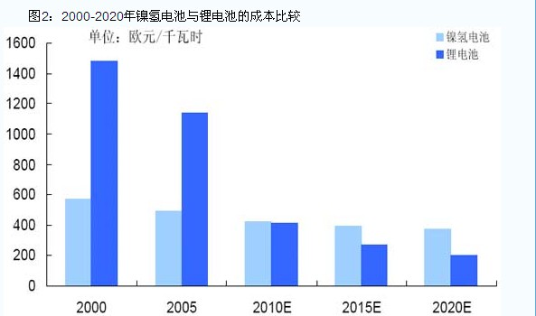 图2:2000-2020年镍氢电池与锂电池的成本比较