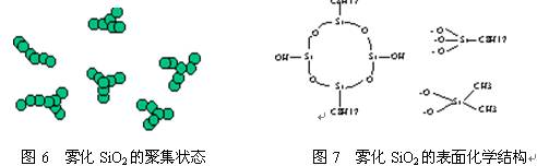 此时若再加入无机填料雾化硅石,根据聚合物中填料的表面效应,雾化SiO2的表面将强烈地吸附分子链。雾化硅石是一种无定形态的纳米多孔SiO2的聚集体,其结构形状如图6所示。这样,在一个SiO2粒子的表面就可连接几条分子链,使分子链间 形成物理交联。同时还由于雾化SiO2 在制备过程中其表面会形成大量羟基-OH(见图7),-OH与PVdF及PVdF-HFP分子链上的氟原子将形成强烈的氢键,从而又能形成链间的化学交联。这样就构成了PVdF体系、PVdF-HFP体系的高分子网络,溶剂与增塑剂都分布在这种高分子网络中。