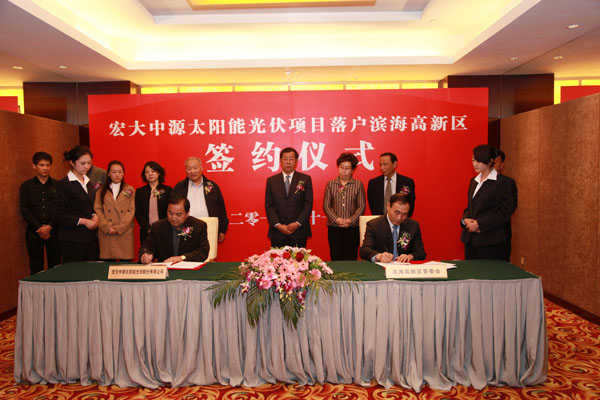 11月11日,鄂尔多斯宏大中源太阳能项目落户高新区签约仪式在赛象酒店举行。副市长王治平、副秘书长王志铭、滨海新区经信委主任金东虎、人民日报社天津分社原社长傲腾、高新区工委书记周思纯出席。宏大中源太阳能股份有限公司董事长薛斌与天津滨海高新区管委会主任赵海山共同签署宏大中源太阳能光伏项目落户天津滨海高新区框架协议。