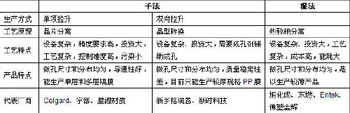 在锂电池的结构中,隔膜是关键的内层组件之一,其主要作用隔离正负极并阻止电子穿过,同时能够允许离子的通过,从而完成在充放电过程中锂离子在正负极之间的快速传输。目前市场化的锂离子电池隔膜主要是以聚乙烯、聚丙烯为主的聚烯烃隔膜,包括单层PE、单层PP、三层PP/PE/PP复合膜。现有的聚烯烃隔膜生产工艺可按照干法和湿法分为两大类。干法工艺又可以细分为单向拉伸工艺和双向拉伸工艺。