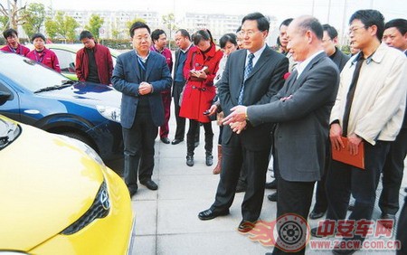 合肥市市长吴存荣在听取相关人员介绍新能源汽车