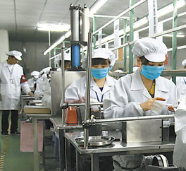 近日,江西福斯特新能源有限公司生产出了该市第一批锂离子电池。图为该公司员工正在生产锂离子手机电池。