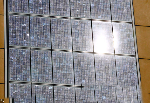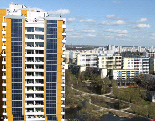 2010年4月1日,德国柏林,一栋70米高的公寓楼在南面外墙上安装了426平方米的太阳能光伏电池板。这些电池板每年大约能生产25.000千万时电,从而帮助居民降低运营成本。