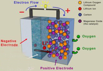普通的锂电池是通过阳极的碳棒移动出来的锂离子,通过电解质(通常是锂盐)转移到阴极的氧化金属上。空气锂离子电池利用一个锂质的阳极和有孔隙的阴极碳棒,让锂离子通过供应的氧气来实现自由移动。不同的是,在外行的眼里,这就是空气锂离子电池的呼吸,锂离子电池的容量大小就是取决于阴极中包含的锂离子数量的多少。采用这种结构就可以使电池更小、更轻并且还有可能更便宜。另外还有可能为安装上这种电池的电动汽车提供更强的动力,使其一次充电行驶100公里甚至更多。