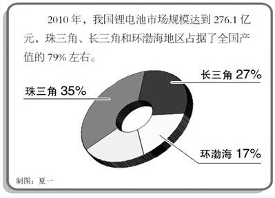 从2010年中国锂离子电池产业产值分布中可以看出,我国的锂电池产业主要集中分布在以广东地区为代表的珠三角、以江浙为代表的长三角和以京津地区为代表的京津唐地区。同时,由于锂电池的产业链向上游延伸到了锂矿资源,因此以江西宜春、四川阿坝、青海和西藏等为代表的锂矿资源丰富的地区则具备了发展锂电池产业得天独厚的条件,这些地区纷纷提出了适合于自身的锂电池产业发展思路。