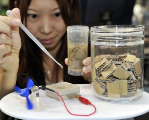 在东京环保产品发布会(Eco-Products conference)上,索尼让一群孩子把纸张放进一种溶液,溶液中混合了水和酶,可以分解纤维素,产生电流。在演示中,这种溶液驱动一个小风扇转动。