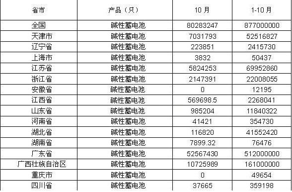 统计数据显示2011年1-10月中国碱性蓄电池产量为877000000只。