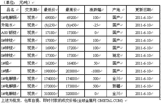 2011年6月10日广东有色现货报价(南储)(铜铝铅锌镍钴镉锰镁铋)