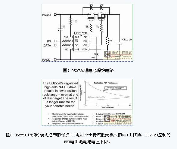 因为过充电(或过放电)锂离子电池可能会导致电池爆炸和人员伤害,所以,在使用这类电池时,安全是主要关心的问题。因此,商用锂离子电池组,包含象DS2720这样的保护电路(图7),DS2720提供可充电Li+电池应用所需的所有电池保护功能:充电期间保护电池,防止超量电流流过的保护电路和限制电池耗尽,电平使电池寿命最长。