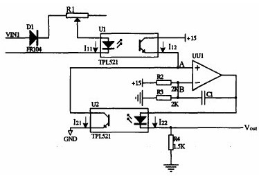 VIN 即电池单体电压,经过R1与光耦中的发光二极管形成回路,将电压信号(VIN)转换为电流信号( I11)。I11与I21有一定比例关系I11∝ I21。UU1 在这里作为比较器使用。当A点电压Va大于B 点电压Vb,UU1 就输出高一些的电压值,当A 点电压Va低于B 点电压Vb,UU1 就输出低一些的电压值。在整个电压采样电路中,比较器形成一个反馈。使A、B 两点的电压值保持一致。这样做的目的是B 点电压显然是15∕2=7.5v, Va= Vb =7.5v,说明上下两个光耦中的三极管导通情况一样。这样,三极管的导通情况是受控于发光二极管的。可知当I21= I22时, I11= I22。这样,VIN∕= I11= I22= Vout∕R4。可见Vout 与VIN 成比例。