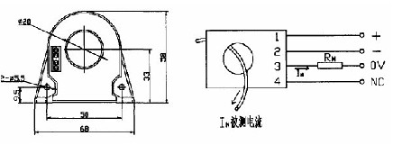 本系统选用的是宇森CBH100SF 型号的闭环霍尔电流传感器。测量频率是0-100KHz,额定电流100A,测量范围:0-±150A,匝数比1:1000,精度0.2%-1%,相应时间:《lus。结构如图3-3 所示:
