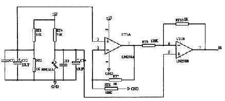 本系统是采用了热敏电阻进行电池本身的温度检测。与电桥电路结合,将温度信号反映为电压信号。电路如图3-4。