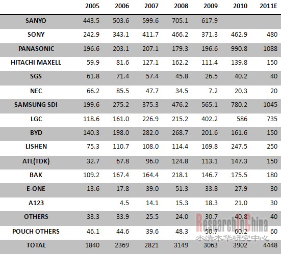 2005-2011年全球主要锂电池厂家出货量(单位:百万单元)