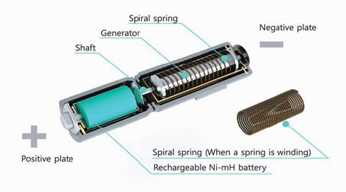 设计师Hwang Yeon Gyeong等人在电池内装置了一套类似发条的发电系统,当电量告罄时,扭动电池上半身,上足发条,松开手后发条就能带动发电系统较长时间运作发电,无需充电器或购买新的电池。