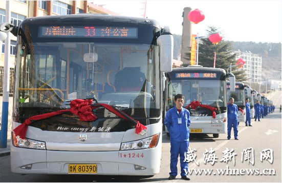 昨日上午9时30分许,在位于环翠区鲸园街道办事处万福山庄外的33路公交首发站点,首批10辆披挂大红花的公交车依次启动,投入到33路公交线路的运营中。