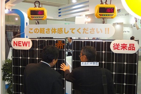 在“PV EXPO 2012”上Fujipream的展区,将模块悬挂在秤下面强调了重量之轻。