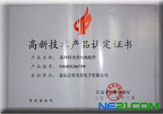 据了解,经江苏省科技厅组成的高新技术企业认定管理工作领小组的综合评审,江苏正信集团晶体硅太阳能电池组件被认定为“高新技术产品”,并授予“江苏省高新技术企业”荣誉称号。标志着正信科技创新水平达到了新高度,同时也是对正信坚持自主创新,为国家高新技术产业发展做出突出成绩的肯定。
