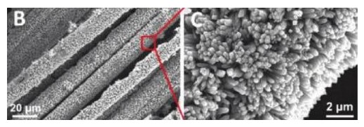 扫描电子显微镜(Scanning electron microscope)图像显示,二氧化钛纳米棒阵列均匀覆盖碳纤维。