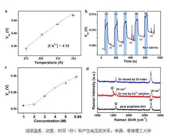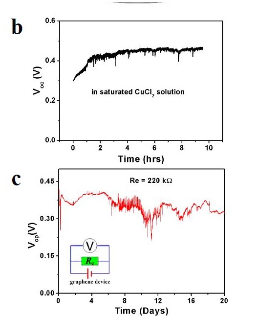 石墨烯电池在饱和氯化铜溶液中,时间(小时、天数)和产生电压的关系。来源:香港理工大学