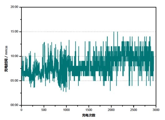 测试数据表明,在6C充电,6C放电,100%DOD的条件下,钛酸锂LpTO单体电池的循环寿命超过25,000次,剩余容量超过80%,同时电芯产生的胀气现象不明显,不影响其寿命;而重庆快速充电纯电动公交的实际应用情况也表明,在电池成组以后,电性能的表现也相当优异,可以保证纯电动公交客车的日常商业化运营。