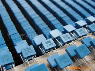 金属化聚酯膜作电介质叠层而成,导线采用镀锡铜包钢线单向引出,矩型阻燃塑料外壳和阻燃环氧树脂封装。具有体积小,重量轻,容量范围广,比率容量大、良好的自愈性,使用寿命长、适用于主要应用于旁路电路、隔直电路、耦合电路、计时电路、振荡电路、变频电路、滤波电路等,特别适用于显示器、电源、节能灯、程控交换机、音箱、音响功放、仪器仪表等。